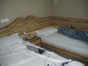 Meniu buvo parašyta, kad jie ir kambarius išnuomoja. Paklausiau apie tai oficianto, jis mane nuvedė pas viršininką už kasos, tas kažką riktelėjo vienam berniukui, jis mane nuvedė kambario apžiūrėti. Mažiukas kambarėlis, be langių, kaip koks skladukas, užtat tik 200 rupijų – pigiausias iš mano matytų.