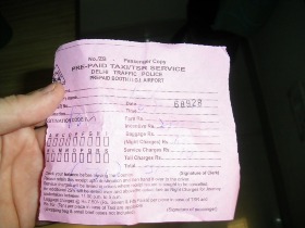 Atstovėjau „prepaid taxi“ kioskelio eilėje, pasakiau, kad man reikia į Pahar Ganj. Paprašė 310 rupijų. Mano smulkiausias banknotas buvo 100, daviau 400. Pasakė, kad grąžos neturės. Pasakiau, kad kitaip neturiu. Paėmė tik 300. Tai kas ką apgavo? Kur tie Indijos apgavikai, melžiantys turistus? Dabar aš pats numelžiau iš taksi tarnybos 10 rupijų (apie 50 lietuviškų centų) Manęs paklausė vardo, išrašė tokį bilietėlį ir pasakė, kad galiu eiti prie bet kurio taksi. Oras toks sodrus, prisotintas, kvepia, lyg kokioje katilinėje – anglimis, degėsiais. Bet nėra bjauru. Net miela kažkaip, primena vaikystę, kai teko gyventi prie geležinkelio, kur savotiškai kvepėjo. Geležinkelio kvapas... Tai jėga, kas supranta.
