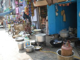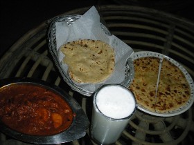 Ant stogo, pasirodo, restoranėlis besąs. Tiesa, vaizdo jokio nesimato ir kanalizacija atsiduoda, bet šiaip tvarkinga, patogūs foteliai, klausausi gatvės triukšmo, šūviai retsykiais pasigirsta, linksma. Užsisakiau tiesiog dūręs pirštu į vegetarinį meniu: Aloo dom, butter Roti, aloo paratham. Alų ar viskį gersite, ser, klausia berniukas. Norėčiau vyno sakau. Turim King Fisher, sako. Bet čia alus, atsakau. Užtat stiprus, atsako. Bet alaus negeriu, noriu vyno, sakau. Oficiantas nuėjo protingesnių pasiklausti, kas per daiktas yra vynas. Arba internete pažiūrėti. Matyt taip ir padarė, grįžęs pradėjo vardinti Indijos vynus, juos, pasirodo čia neseniai pradėjo daryti. Kokio galit parodyti, klausiu. Jokio, bet palaukit truputį, gausim visko. O gal turite lassi (tokio skanaus kefyro su prieskoniais), paklausiau. Obižaješ, načalnik, atsakė, pas mus pats geriausias. Tai duokit čia, sakau. Tai atšaukti alų ir viskį, klausia, lyg būčiau užsakęs... Puikus restoranėlis, nereikėjo ilgai laukti. Buvau vienintelis klientas, netoli plepėjosi koks dešimt darbuotojų, yra kam mano užsakymus vykdyti. Tai ką gavau buvo labai skanu. „Aloo“ reiškia bulvę, taigi, gavau tokį lavašinį blyną su bulvių košės įdaru ir aštrų daržovių-prieskonių troškinį su bulvių gabalėliais. Soti vakarienė kainavo 150 rupijų, kokius 8 litus, brangus restoranas.