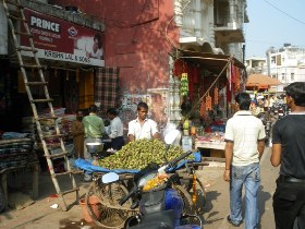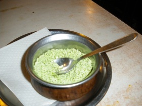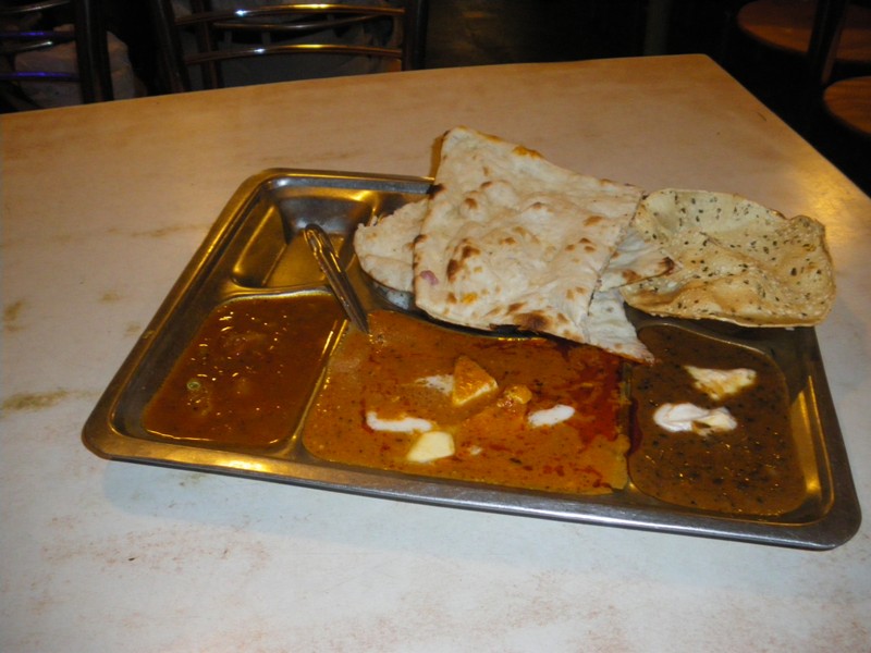 Praalkau, susiradau valgyklėlę su trim staleliais. Prie jų kasa, prie jos išdidus dėdė su dideliu tiurbanu sėdi, sikhas matyt. Sako, sikhai niekada neapgaudinėja, bet gal čia apsimetėlis indusas galvą apsivyniojęs... Aplink porą sėdinčių klientų trys berniukai laksto, dar penki stovi, laukia, kol jų viršininkas prie kasos duos jiems komandą. Televizorius gražią muzikėlę rodo. Prisėdau, meniu atnešė. Užsisakiau tali (tokį daržovių troškinių rinkinėlį),roti duonos su sviestu ir limonado atsigerti. Limonadas vadinasi Limca, jis labai populiarus Indijoje, citrinos skonio, saldus. Už viską sumokėjau 110 rupijų, bus kokie šeši litai mūsiškais. Kaip bonusą dar atnešė deserto – lėkštelę tokių žaliai dažytų saldainėlių, ryžio grūdo didumo, anyžių skonio.