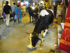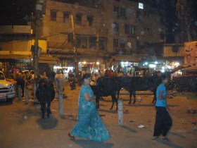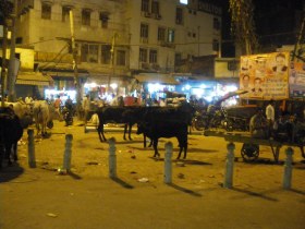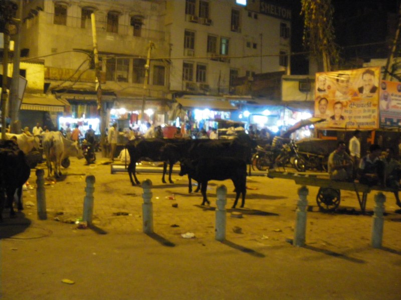 Iš tikrųjų, įsukus į centrą pamačiau rikšas, motorines ir dviratines, karves, daug miegančių žmonių gatvėje. Skamba indiška muzika, slankioja kažkokie šešėliai, ir viskas penktą ryto.